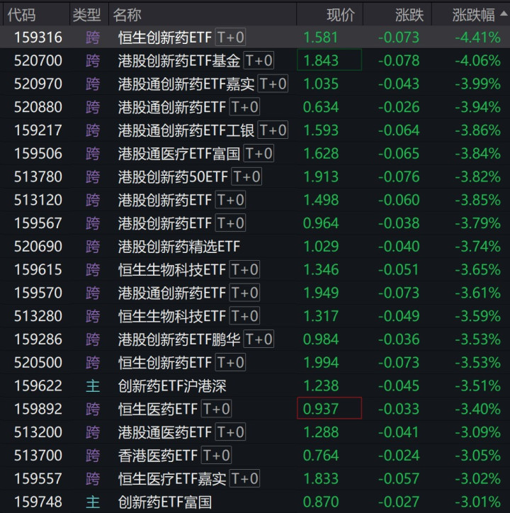 受盘面影响,多只港股创新药相关ETF跌超3%。